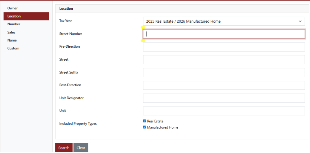 The address search is ideal if you know the street location but not the parcel number or owner name. Enter the house number and street, along with additional details like suffix or city, to get precise results.